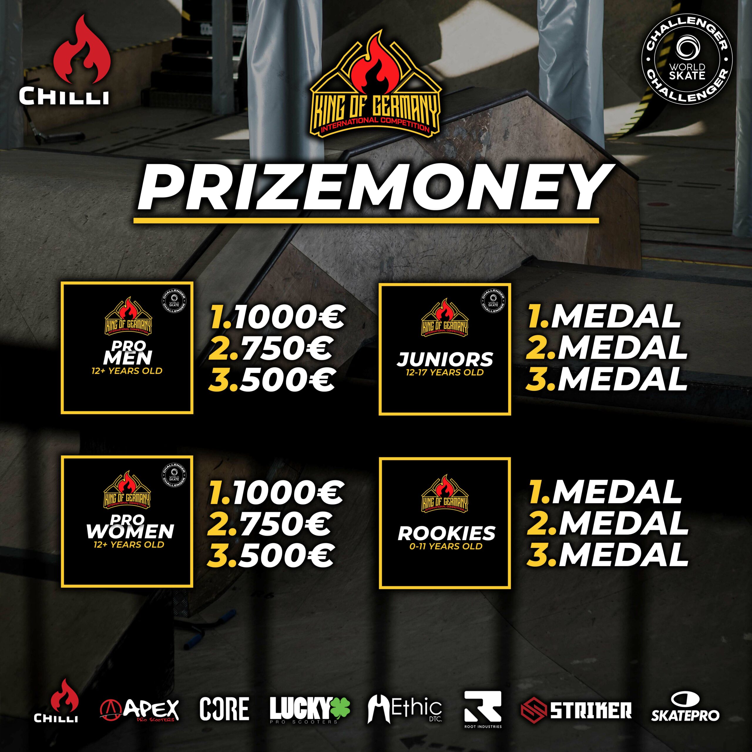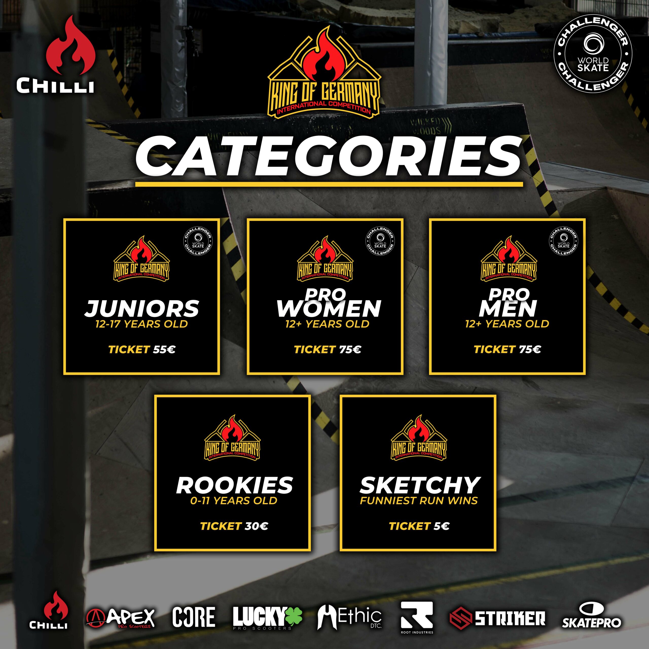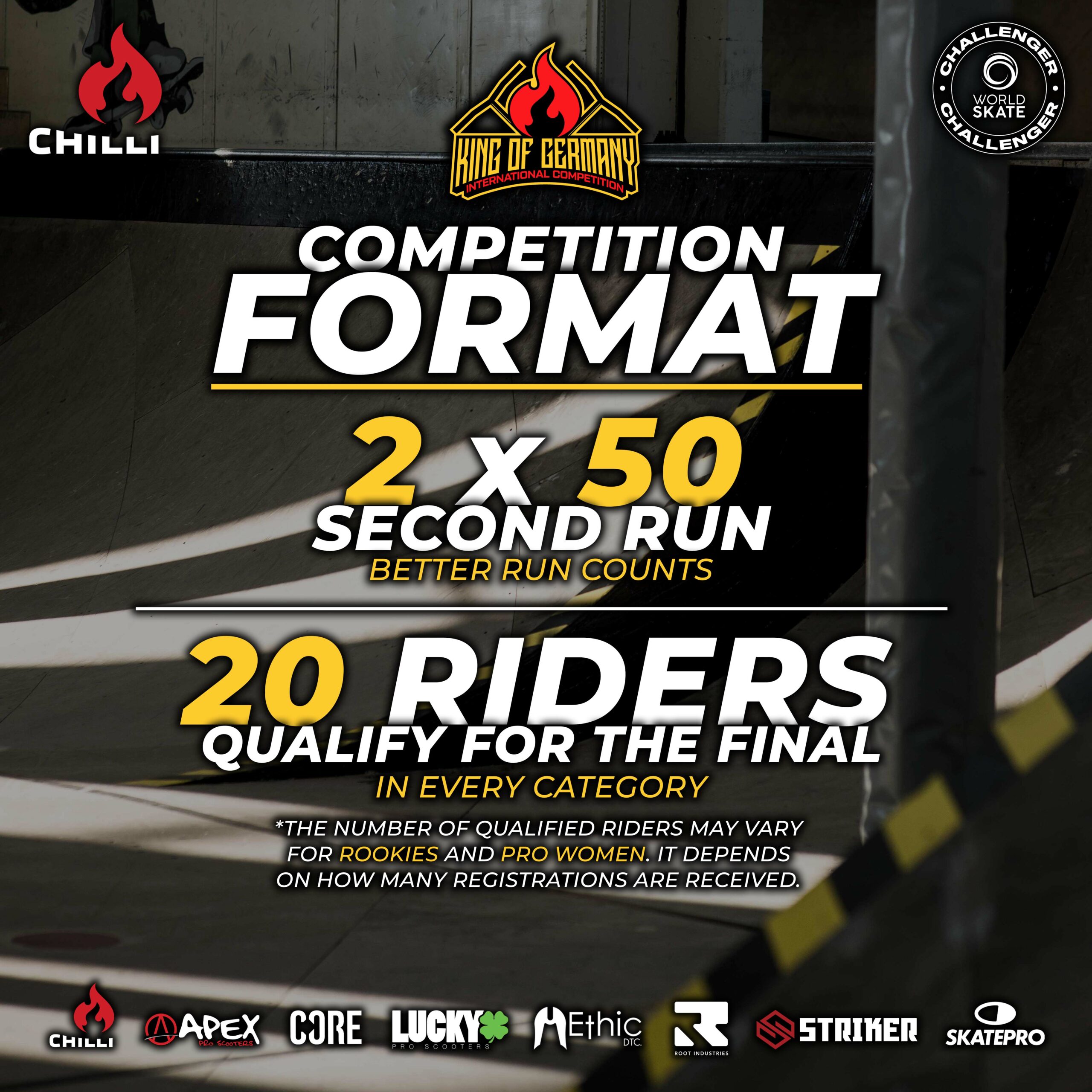 The King of Germany, presented by Chilli Pro Scooter, is a competition where riders from all over the world can put their skills to the test. In a total of five divisions – Pro Men, Pro Women, Juniors, Rookies and Sketchy – participants of all ages and abilities have the opportunity to compete against each other and showcase their talent on the big stage.