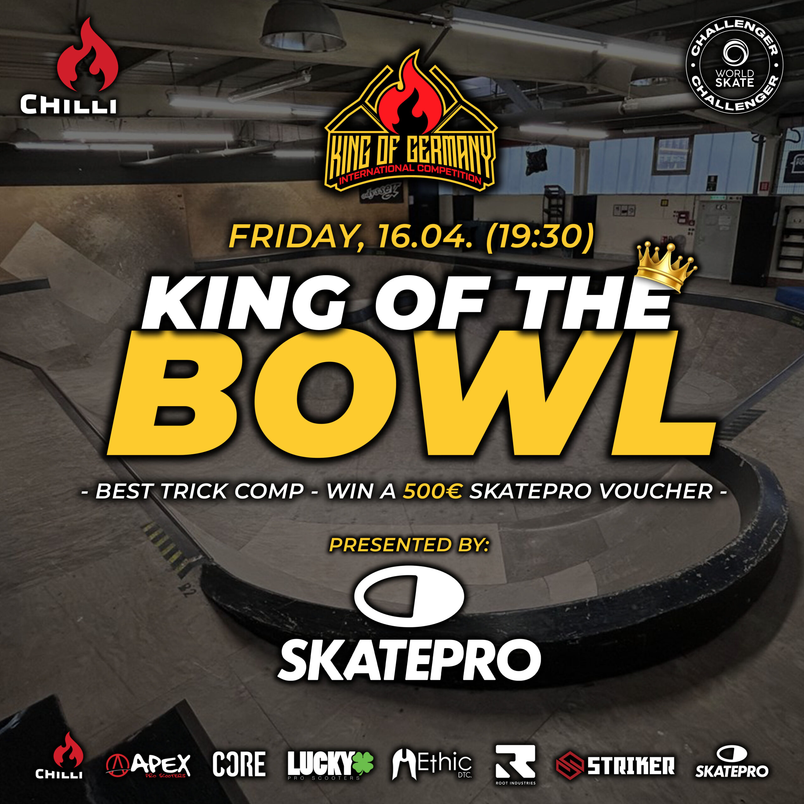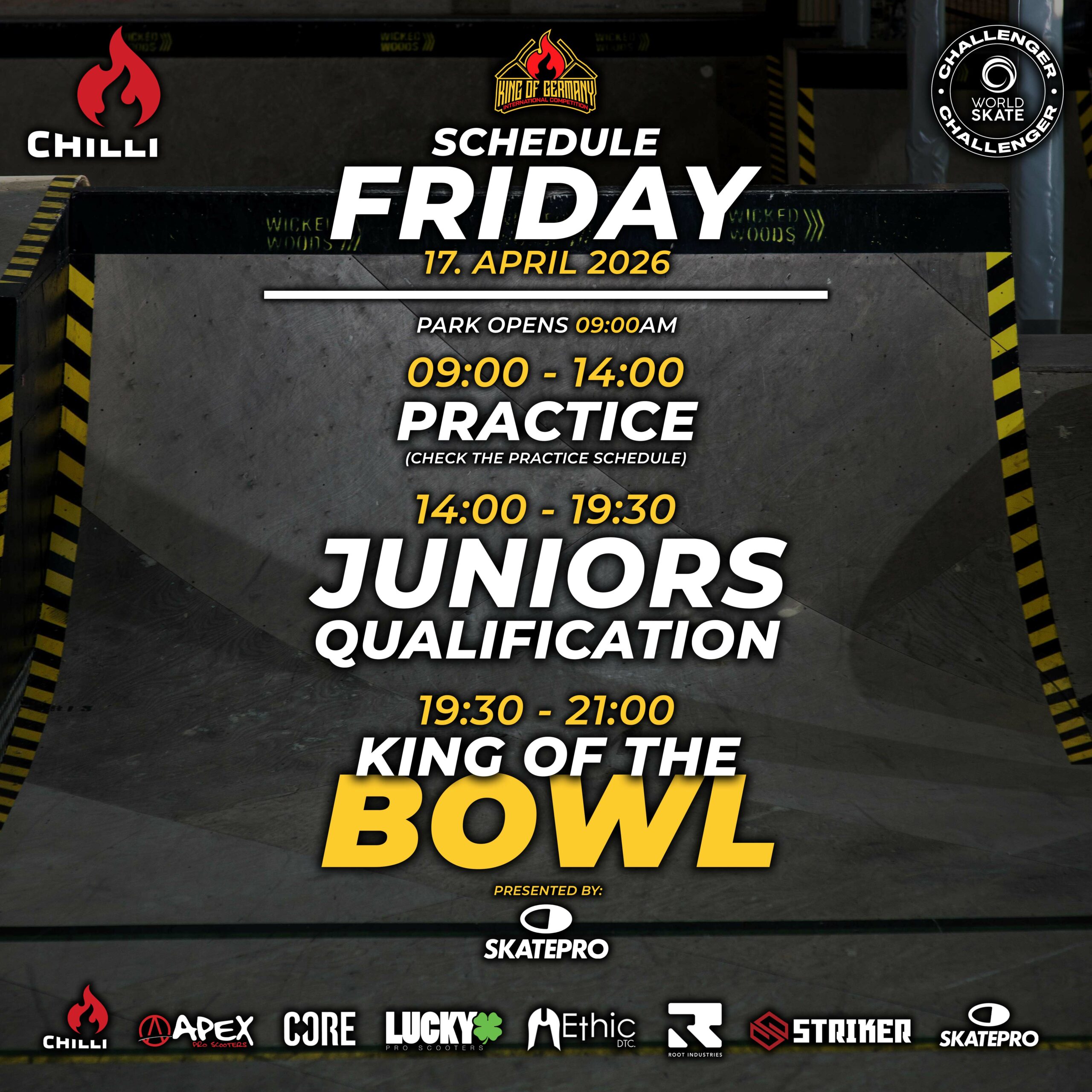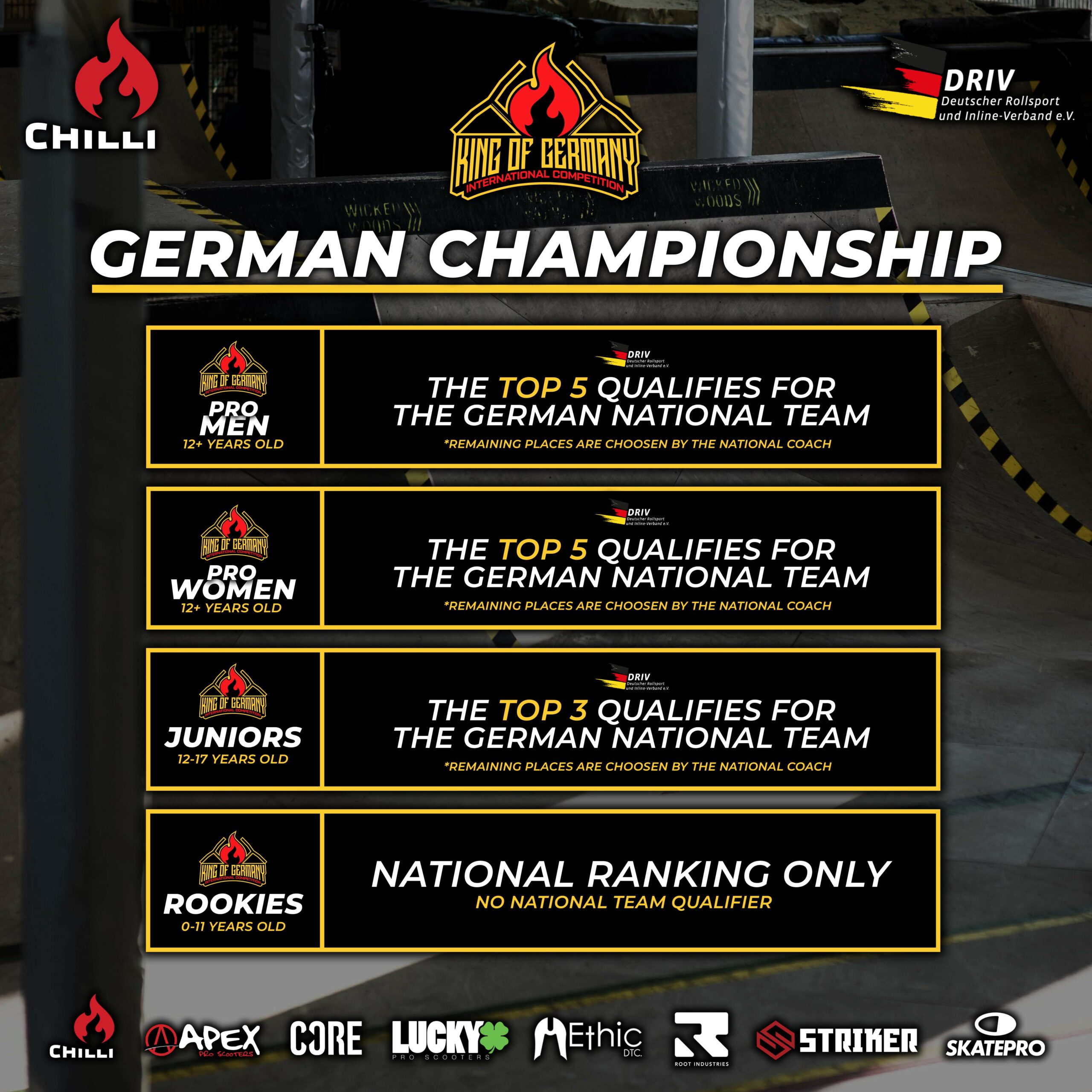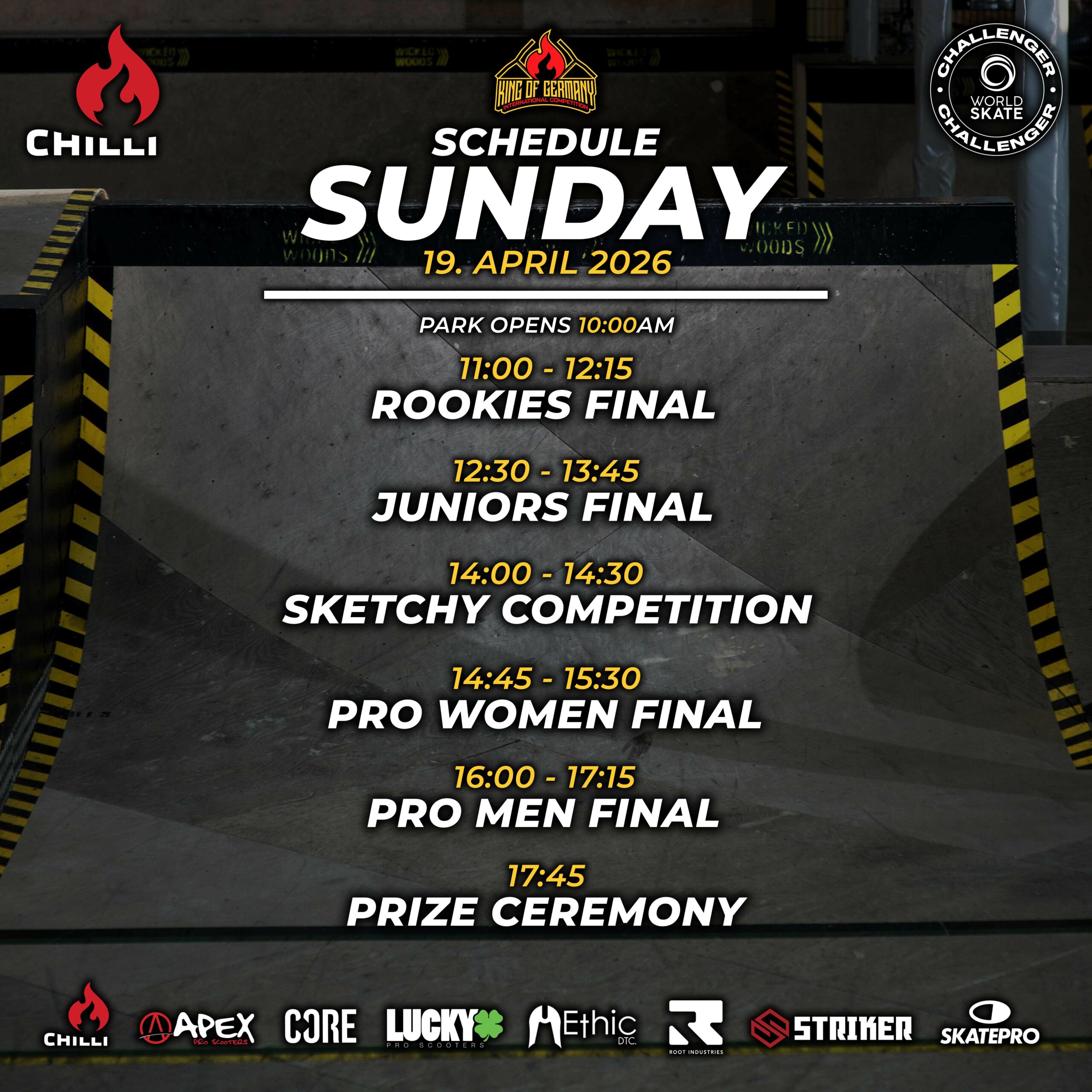 The King of Germany, presented by Chilli Pro Scooter, is a competition where riders from all over the world can put their skills to the test. In a total of five divisions – Pro Men, Pro Women, Juniors, Rookies and Sketchy – participants of all ages and abilities have the opportunity to compete against each other and showcase their talent on the big stage.
